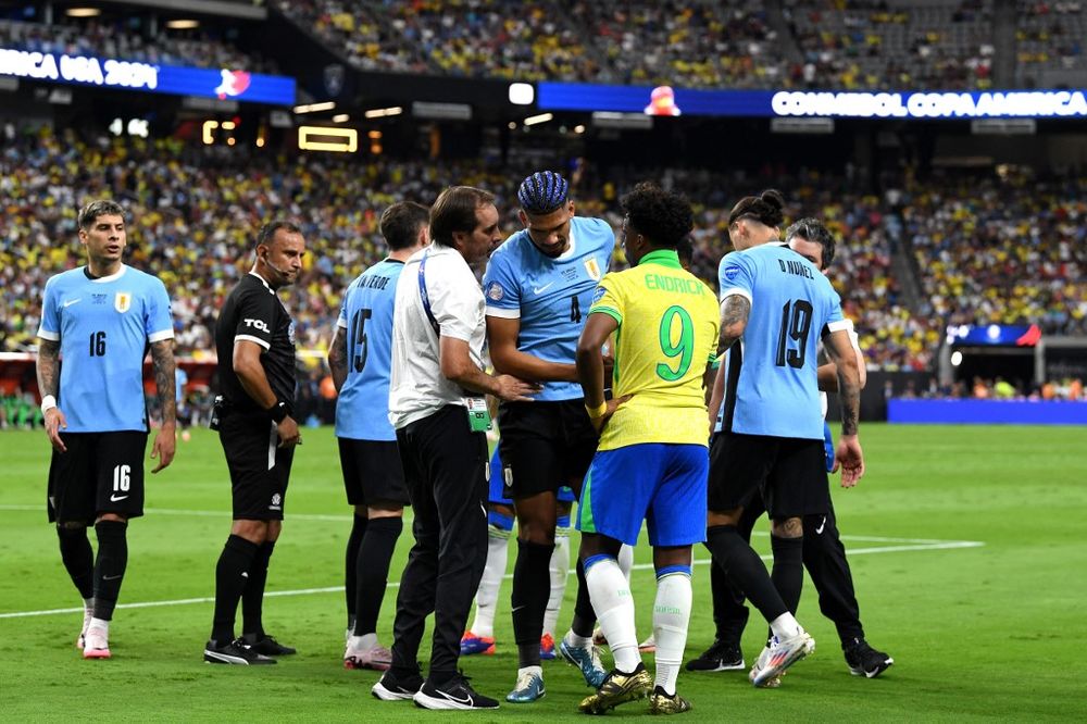 20240706 SOC-SPO-URUGUAY-V-BRAZIL-CONMEBOL-COPA-AMERICA-USA-2024 LAS VEGAS, NEVADA – JULY 06: Ronald Araujo of Uruguay leaves the pitch after suffering an distress throughout the CONMEBOL Copa The United States 2024 quarter-final match between Uruguay and Brazil at Alleg