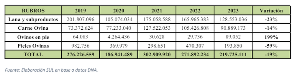El mejor registro data de 2018 con US$ 327,4 millones logrados por exportaciones totales del rubro ovino, con el menor monto en 2020, US$ 186,9 millones.