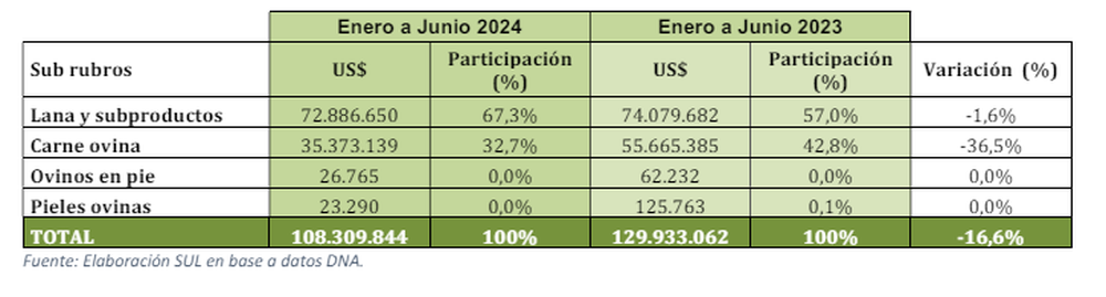 En el semestre inicial de 2024 los ingresos de divisas al país por las exportaciones generales del rubro ovino fueron 17% menores a los del mismo lapso de 2023, alcanzando los US$ 108,3 millones, actualizó esta semana el Secretariado Uruguayo de la Lana (SUL).