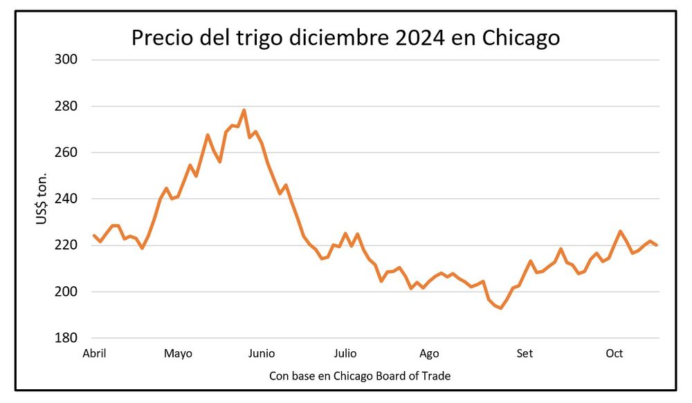 El trigo posición diciembre avanzó de US$ 216 a US$ 220 por tonelada en el stability semanal, con referencias para Uruguay que no dejan de ser interesantes en el caso de la cebada –atada al precio del trigo Chicago- que se sostienen por encima de los US$ 220/ton y de US$ 205/ton para el trigo.