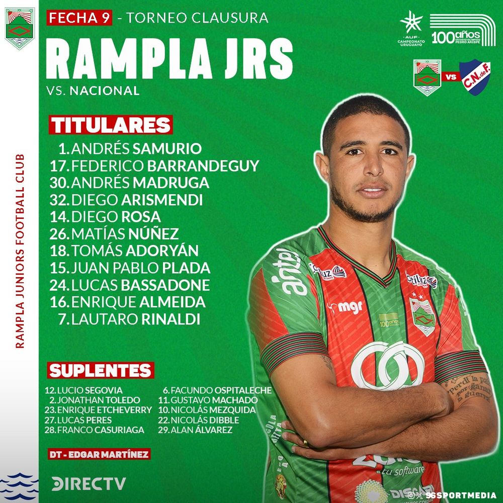 Con bastante antelación, el entrenador Edgard Martínez definió al equipo de Rampla Juniors que jugará con Andrés Samurio, Federico Barrandeguy, Andrés Madruga, Diego Arismendi, Diego Rosa; Matías Núnez, Tomás Adoryan, Juan Pablo Plada, Lucas Bassadone; Enrique Almeida y Lautaro Rinaldi.