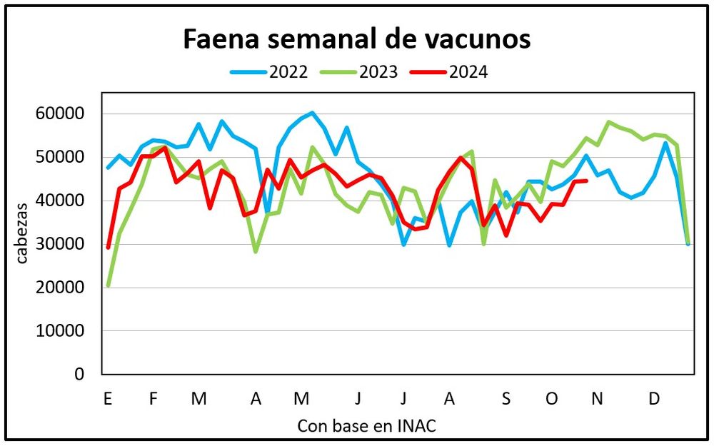 La faena de la semana pasada fue de 44.543 vacunos, estable frente a la semana anterior.