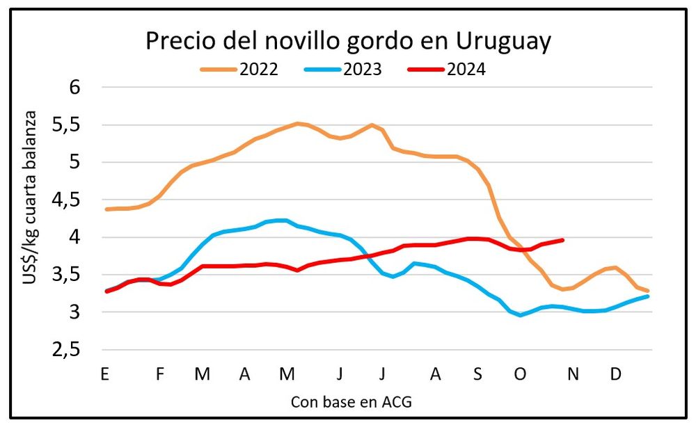 En Uruguay, en tanto, el precio de exportación viene mostrado ganancias. En los últimos 30 días móviles promedió US$ 4.368 por tonelada, el mejor valor del 2024 y el más alto desde junio de 2023. En la última semana fue de US$ 4.777, de acuerdo a los datos preliminares del Instituto Nacional de Carne (INAC).