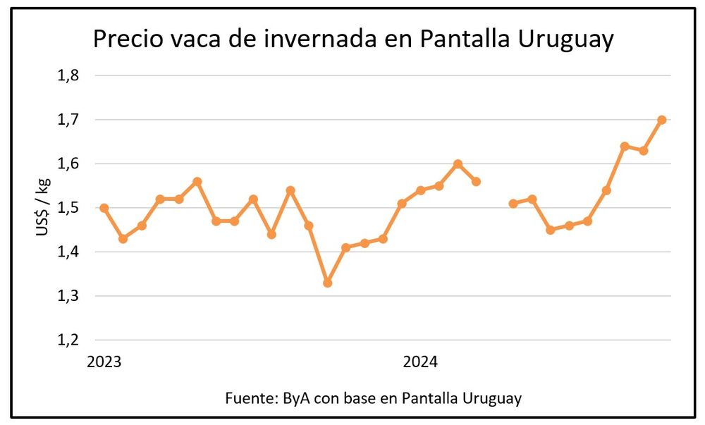 En el remate de Pantalla Uruguay esta semana hubo un alto porcentaje de colocación, con destaque para las vacas de invernada que promediaron US$ 1,70, una suba mensual de 4,3% y el mejor valor para el consorcio desde noviembre de 2022.
