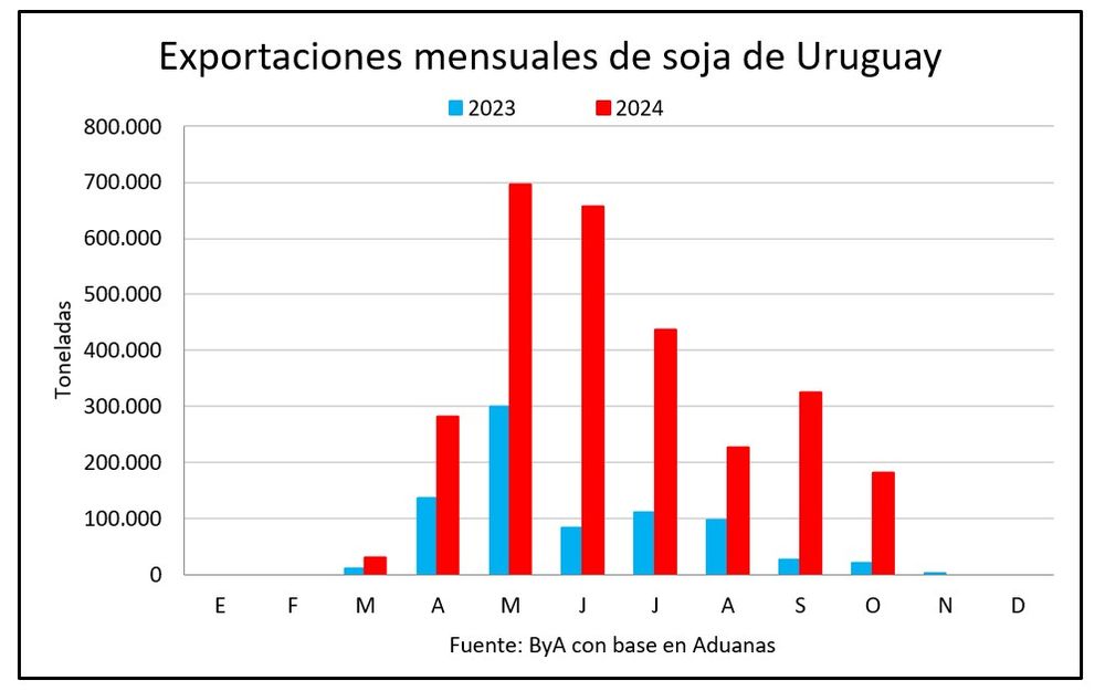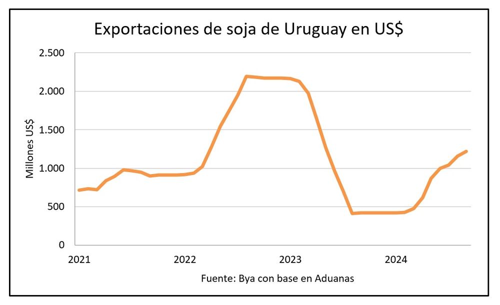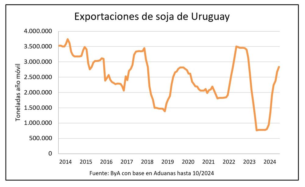 De ese complete, entre marzo y octubre Uruguay exportó 2,83 millones de toneladas. La facturación en 2024 es de US$ 1.218 millones –el triple que en todo 2023–, a un promedio de US$ 425 por tonelada, precio embarque.