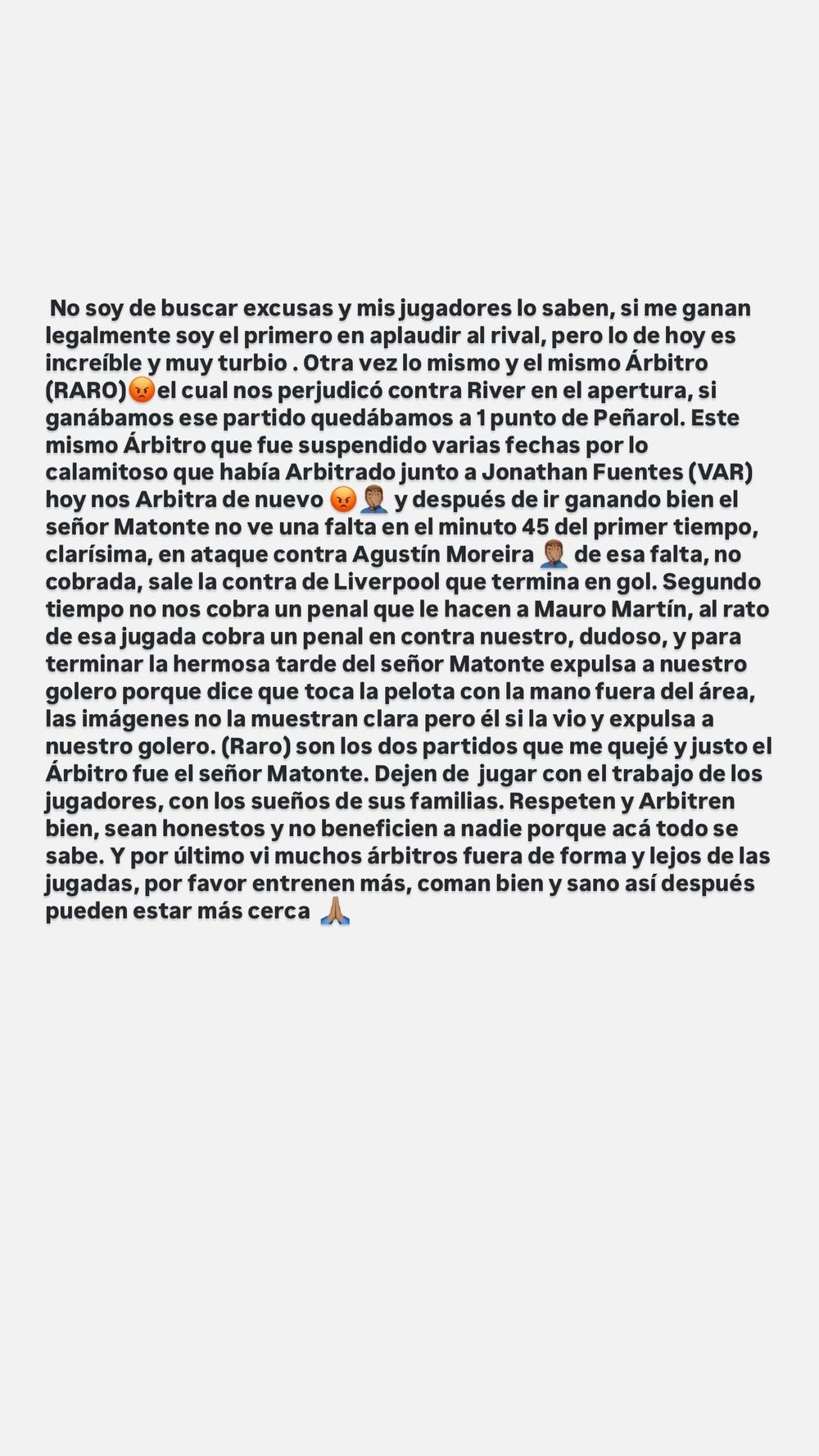 «Después de ir ganando bien, el señor Matonte no ve una falta en el minuto Forty five del primer tiempo, clarísima, en ataque, contra Agustín Moreira. De esa falta, no cobrada, sale la contra de Liverpool que termina en gol. Segundo tiempo no nos cobra un penal que le hacen a Mauro Martín. Al rato de esa jugada cobra un penal en contra nuestro, dudoso, y para terminar la hermosa tarde del señor Matonte expulsa a nuestro golero porque dice que toca la pelota con la mano fuera del área. Las imágenes no la muestran clara, pero él sí la vio y expulsa a nuestro golero», dijo sobre la roja que le tocó ver a Nahuel Suárez.