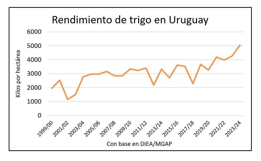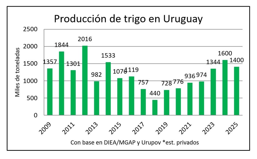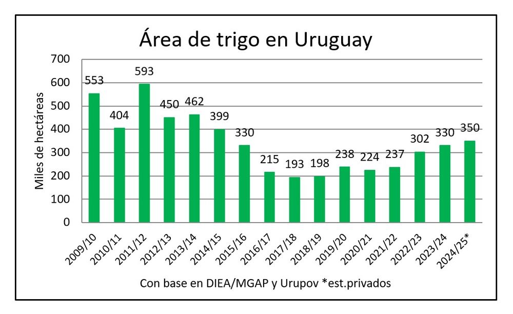 En la zafra de 2023, última campaña concluida, el área full de cultivos de invierno fue 607.246 hectáreas, con 266.791 has de trigo y 191.017 has de cebada.