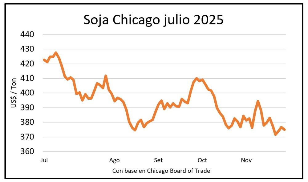 En la Bolsa de Chicago la soja cerró apenas arriba del piso para los últimos dos años de US$ 374,14 por tonelada alcanzado la semana anterior y marcó US$ 374,94 en la posición julio 2023. La soja perdió US$ 35 en los últimos dos meses, un 8,5%.