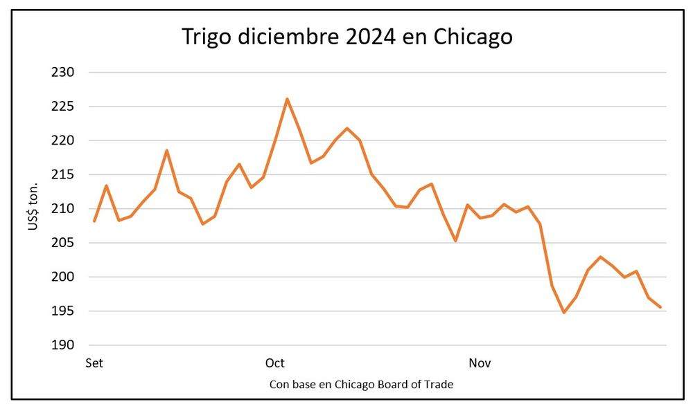 El trigo tuvo un nuevo tropiezo en la Bolsa de Chicago y perdió más de 2% del valor en la posición diciembre y casi 3% para marzo. En Uruguay los operadores ofrecían este viernes entre US$ 195 y US$ 197 por tonelada de trigo de la próxima cosecha y entre US$ 195 y US$ 200 por tonelada de cebada cervecera. La cebada forrajera cotiza entre US$ 170 y US$175.