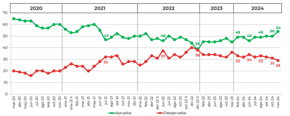 En el análisis de la encuesta, Equipos sostiene que los resultados de noviembre «muestran un crecimiento de la aprobación respecto al mes anterior«, ya que pasó de 50% a 54%.