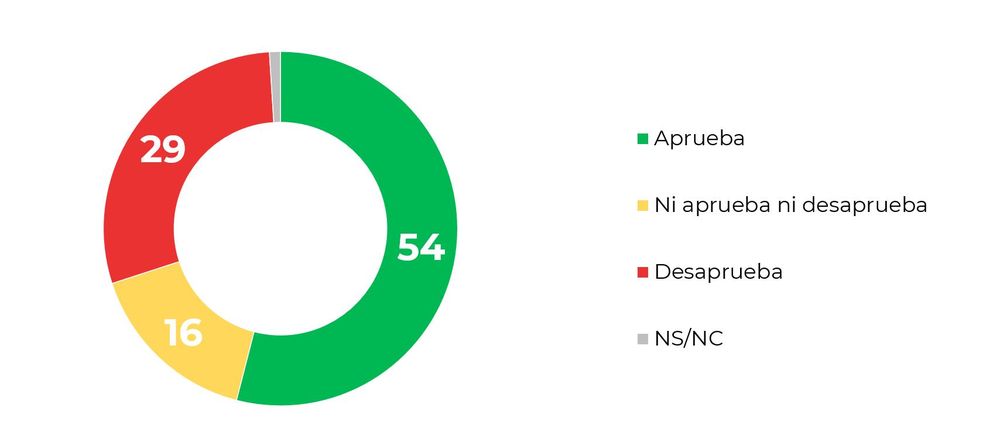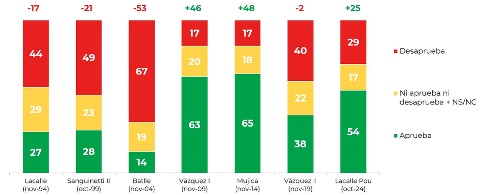 Los datos muestran que para noviembre 54% de los uruguayos dijeron aprobar la gestión de Lacalle Pou, 29% que la desaprueban y 16% ni una cosa ni la otra. El saldo positivo, entonces, fue de +25.