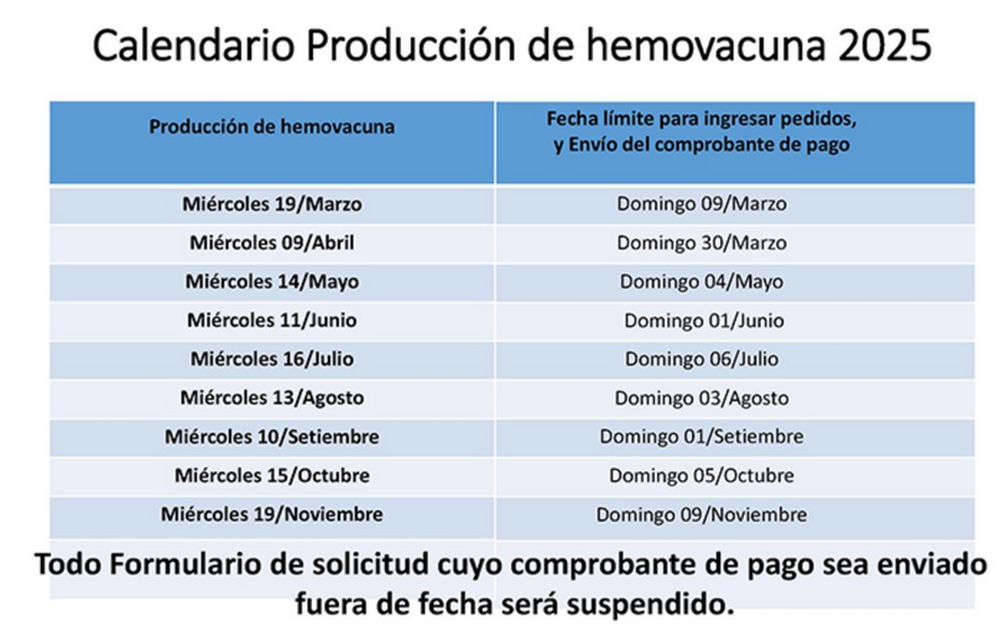 Fechas 2025 de producción de Hemovacuna y calendario para solicitud de dosis y envío de comprobante de pago: