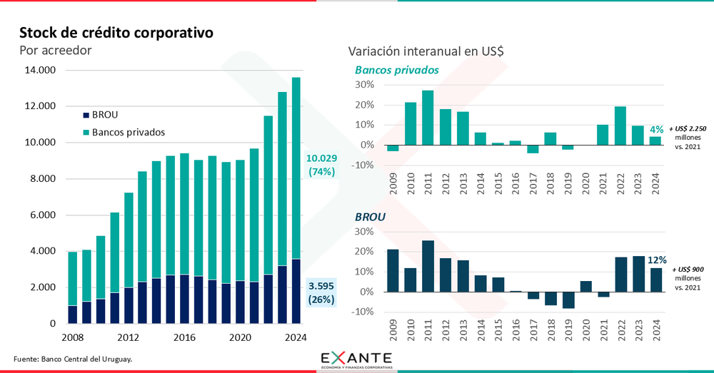 De acuerdo con Exante, el crédito corporativo creció tanto en los bancos privados como en el Banco República (BROU), aunque lo hizo con mayor intensidad en el banco estatal.