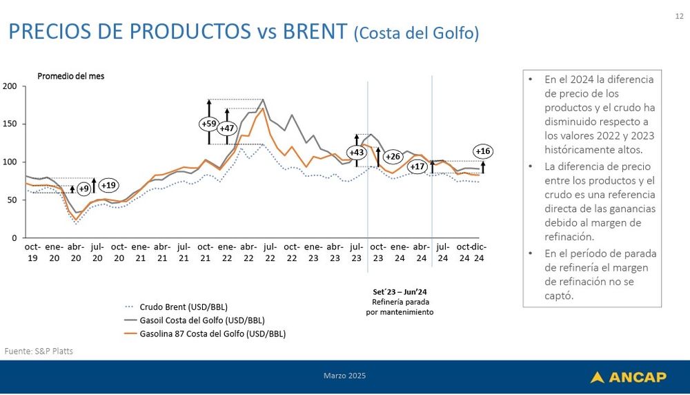 En la medida en que el complejo industrial volvió a operar ya avanzado el 2024 no logró capturar gran parte del margen potencial de refinación. Ese margen fue evolucionando desde valores récords que se dieron en 2022 y 2023 –la famosa «espalda financiera»– hacia valores menores que se dieron progresivamente el año pasado pero que todavía eran altos.