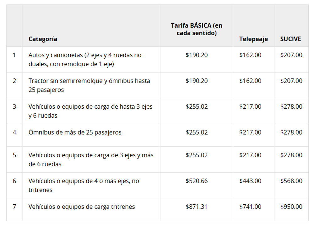 Los valores varían según la categoría del vehículo y el método de pago. Para autos y camionetas, la tarifa básica por cada sentido se estableció en $190. Si se paga con Telepeaje, el costo baja a $162, mientras que con SUCIVE la tarifa asciende a $207.