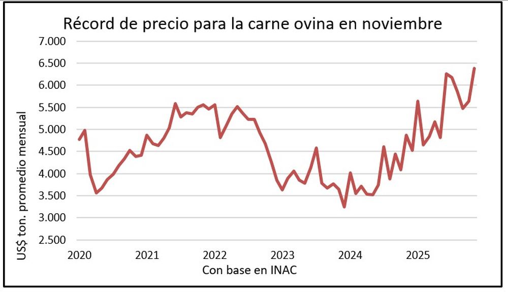 Los valores de la hacienda se sostienen en precios récord de exportación: la tonelada de carne ovina embarcada promedió US$ 6.379 en noviembre, una suba de 31% anual.