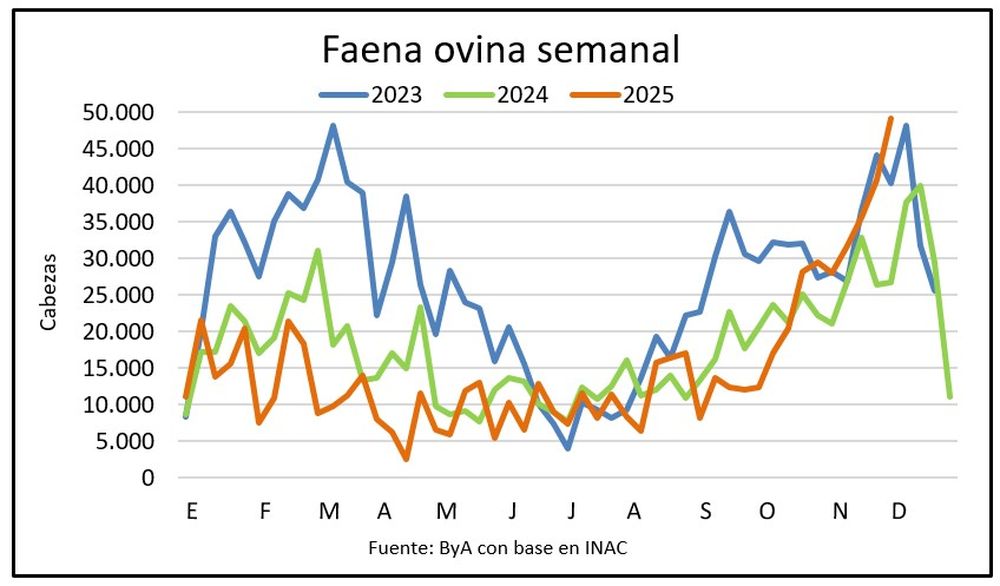 En noviembre la faena ovina aumentó 26,3% interanual y en lo que va de 2025 la diferencia se acortó a -9,9% según las cifras de INAC hasta el 6 de diciembre. La brecha entre los corderos se achicó más aún y es de solo 2,1%.