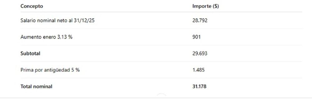 A ese valor se le descontarán los aportes correspondientes y será el mismo salario (si no hay extras o faltas) hasta el 30 de junio, pues a partir del 1º de julio habrá otro incremento salarial por el ajuste por inflación más el aumento del nuevo convenio.