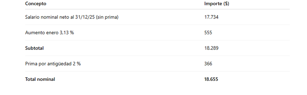 Al 31 de diciembre tenía un salario nominal de $ 18.000 por 24 horas semanales, incluida la prima por antigüedad. En este caso también se debe determinar el salario nominal sin tomar en cuenta el 1,5% de la prima generada por los años anteriores, que sería de $ 17.734 Este valor se obtiene excluyendo del salario nominal complete el monto correspondiente a la prima por antigüedad, para aplicar el ajuste únicamente sobre la infamous salarial.