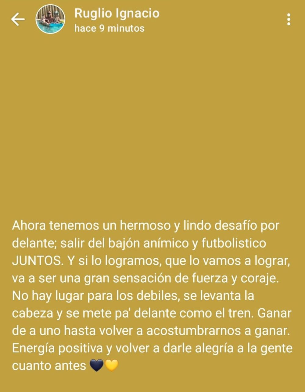Y añadió: «No hay lugar para los débiles, se levanta la cabeza y se mete pa’ delante como el tren. Ganar de a uno hasta volver a acostumbrarnos a ganar. Energía positiva y volver a darle alegría a la gente cuanto antes».